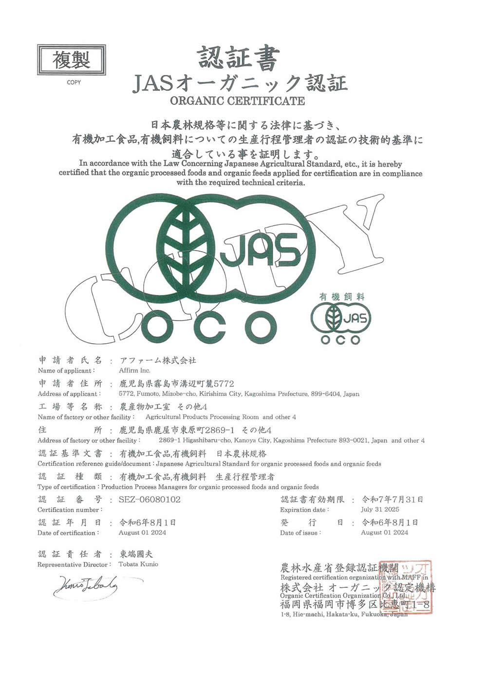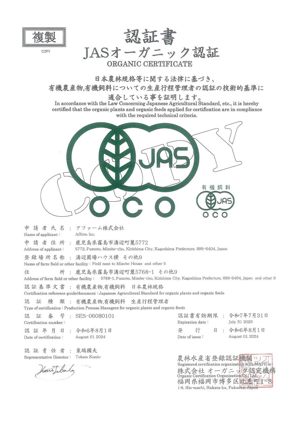 有機農産物・有機飼料・有機加工食品のJASオーガニック認証書